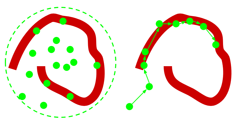 En el siguiente diagrama se muestra un color rojo una distribución compleja de la cual nos interesa obtener muestras. La figura de la izquierda muestra la técnica de muestreo por importancia. La figura de la derecha en cambio muestra como funciona MCMC.