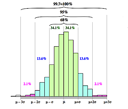 \(\begin{array}{lll} P(\mu-\sigma < X < \mu+\sigma) & = & 0.68\\ P(\mu-2\sigma < X < \mu+2\sigma) & = & 0.95\\ P(\mu-3\sigma < X < \mu+3\sigma) & = & 0.997\\ \end{array}\)