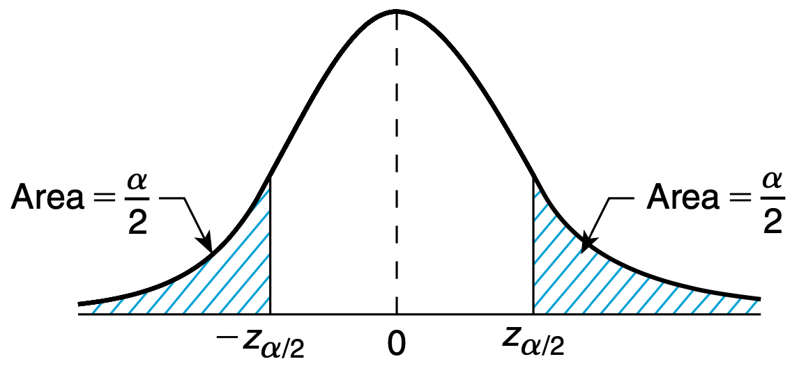 Sea \(z_{\frac{\alpha}{2}}\) tal que \(P(Z > z_{\frac{\alpha}{2}}) = \frac{\alpha}{2}\), entonces \(z_{\frac{\alpha}{2}}\) es el percentil \(100(1-\frac{\alpha}{2})\) de \(Z\). Además, \(P(|Z| > z_{\frac{\alpha}{2}}) = \alpha\).