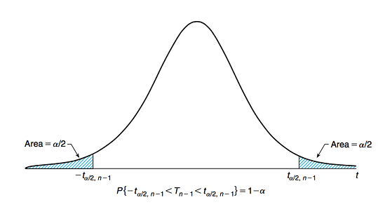 Normalmente, utilizamos \(t_{\frac{\alpha}{2},n-1}\) en prueba de hipótesis. Veamos esto! Sea \(t_{\frac{\alpha}{2},n-1}\) tal que \(P(T_{n-1} > t_{\frac{\alpha}{2},n-1}) = \frac{\alpha}{2}\), entonces \(t_{\frac{\alpha}{2},n-1}\) es el percentil \(100(1-\frac{\alpha}{2})\) de \(T_{n-1}\).